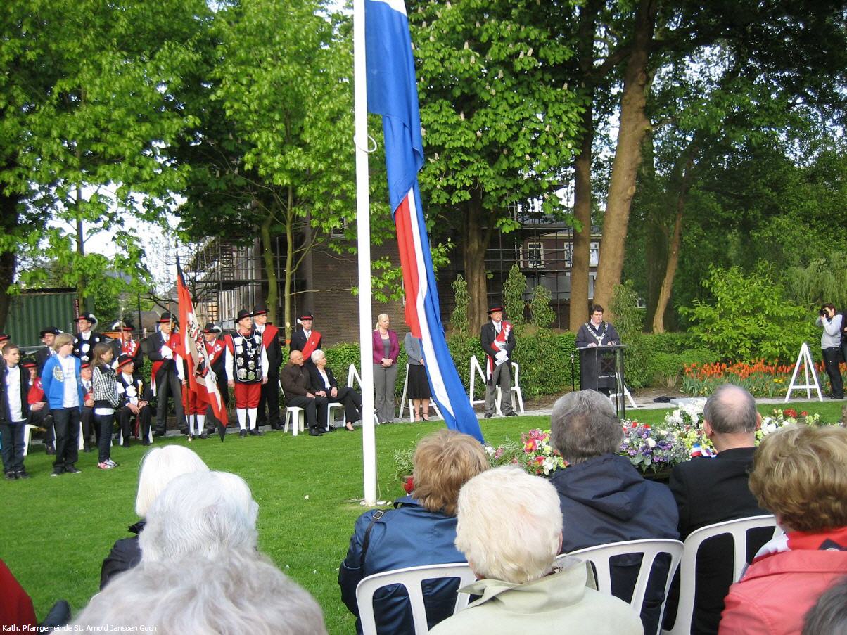 Dort findet am Vorabend des niederländischen Feiertages – Befreiung von der deutschen Besatzung im 2. Weltkrieg – ein Totengedenken für die Verstorbenen aller Kriege statt. Thema der teilweise von den Kindern der Bernadetteschool gestalteten Gedenkfeier im Theater „De Blauwe Kei“ war in diesem Jahr „What oorlog met mensen doet“ – Was Krieg für die Menschen bedeutet. Im Anschluss daran zogen alle - begleitet von St. Barbara-Gilde und Tambour-Corps - im Schweigemarsch zum Denkmal.