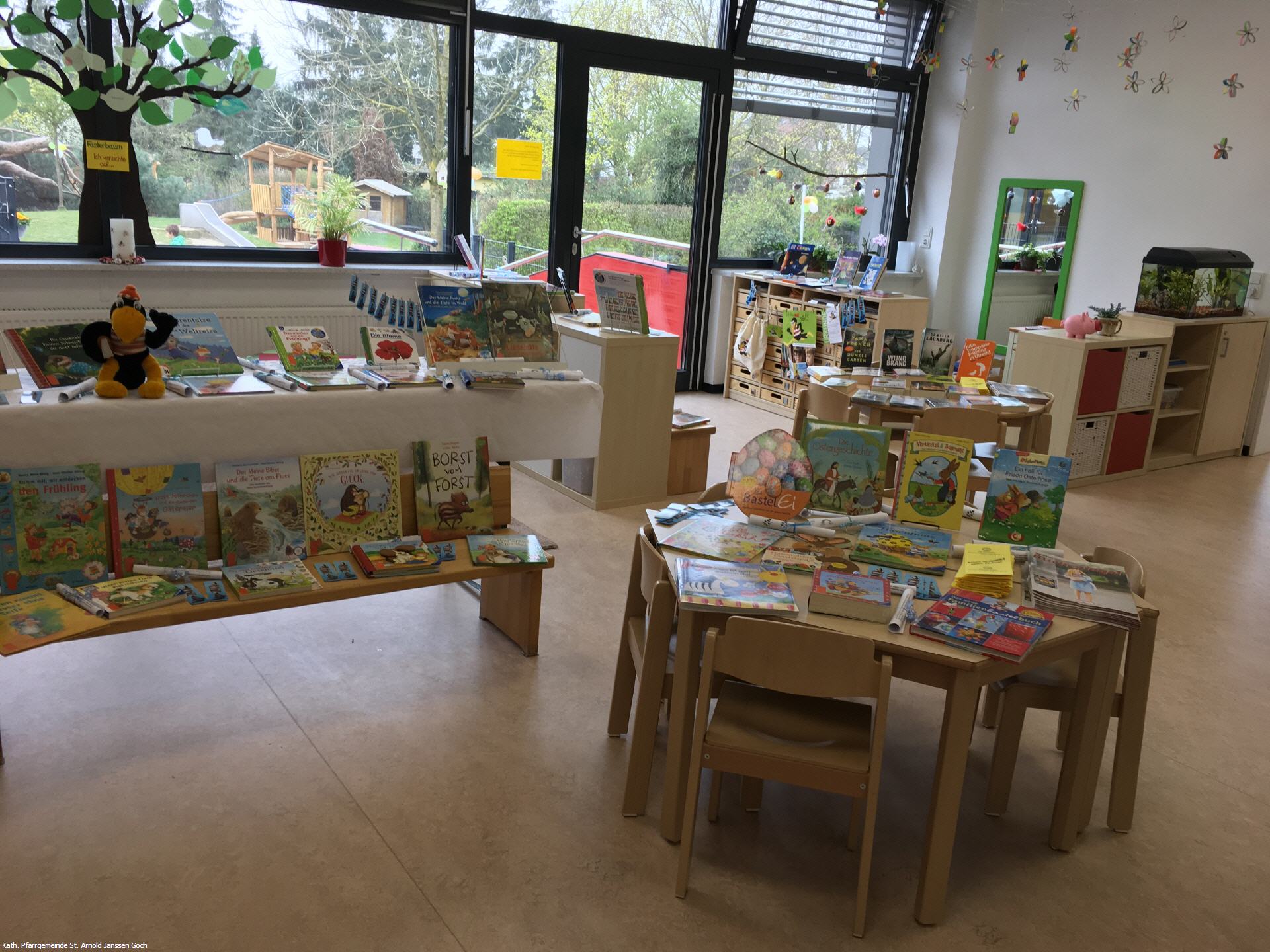 Im schönen hellen Gruppenraum der Marienkäfergruppe war genügend Platz, um einige Bücher rund um das Thema Frühling auszustellen. Aber auch andere schöne Bilderbücher, Kinder- und Erwachsenenbücher sowie CDs und DVDs sollten Kinder und Eltern dazu animieren, die Bücherei an der Arnold Janssen-Kirche einmal zu besuchen.