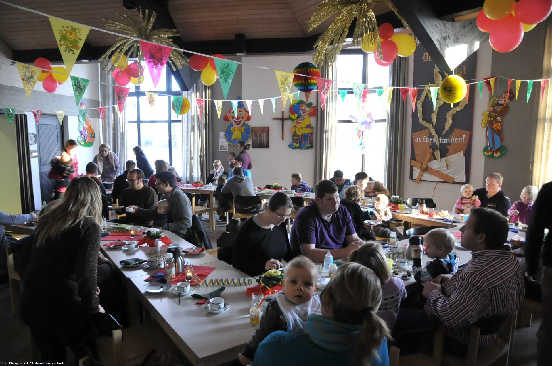 Im karnevalistisch geschmückten Pfarrheim wartete dann frischer Kaffee und ein leckeres Kuchen-Büffet auf die Gäste. Der „Renner“ bei den Kindern waren die von Klemens Verhülsdonk frisch gebackenen Herzchen-Waffeln. Nach dem Kaffee blieb für die Erwachsenen noch Zeit für nette Gespräche, und die Kinder konnten noch eine Weile die schönen Spielsachen ausprobieren und sich mehr oder weniger zaghaft miteinander anfreunden.