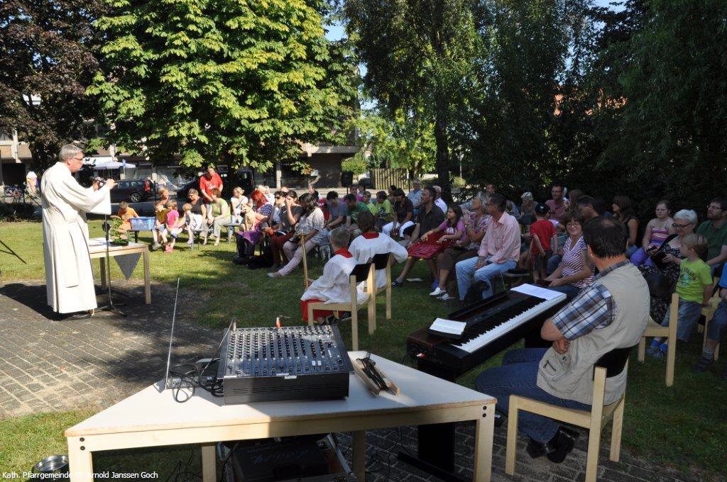 Bei herrlichem Sonnenschein fiel es leicht, ein Loblied auf Gottes schöne Schöpfung zu singen. Im Pfarrgarten an der Arnold-Janssen-Kirche in Goch stimmten ungefähr 70 Erwachsene und Kinder mit ihren Haustieren ein in den Lobpreis auf all das, was Gott uns geschenkt hat. Der Familienausschuss der Arnold-Janssen-Gemeinde hatte zu einem Wortgottesdienst mit Diakon Werner Kühle eingeladen. Musikalisch begleitet wurde der Gottesdienst mit fröhlichen Liedern von Wolfgang Nowak.
