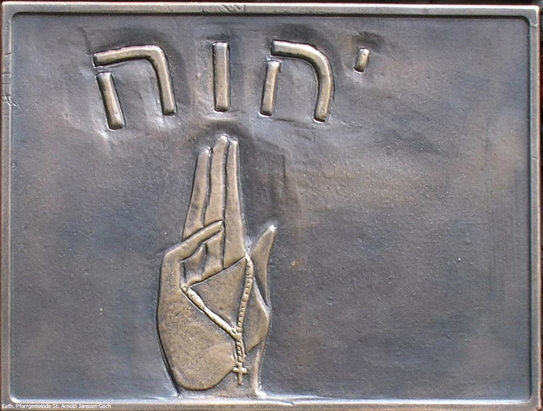 Vertrauensvoll, ja liebevoll sprechen wir Gott an. Die zum Himmel erhobene Hand verweist auf den hebräisch geschriebenen Namen Gottes. Doch der Name Gottes soll von uns geheiligt werden. Wir nehmen ihn aus unserem Sprachgebrauch heraus, obwohl wir ihn kennen. So entzieht sich der Name Gottes durch diese besondere Ehrung unserer Verfügbarkeit. Doch Gott bleibt uns in der vertrauten Anrede als Vater nahe.