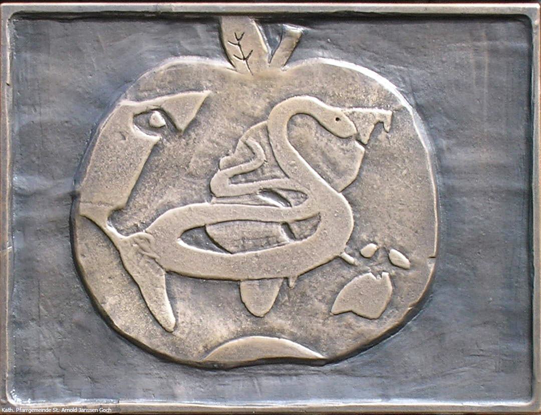 Der Apfel symbolisiert die erste Versuchung des Menschen, Gottgleich sein zu wollen. Sie findet sich überall auf der Welt. Der Versucher im Zeichen der Schlange ist mitten unter uns. In der Welt gibt es täglich neue Versuchungen, die uns auffordern, über den Willen Gottes nachzudenken: Tue ich das Richtige? Oder bin ich der Meinung, Gott nicht zu brauchen?